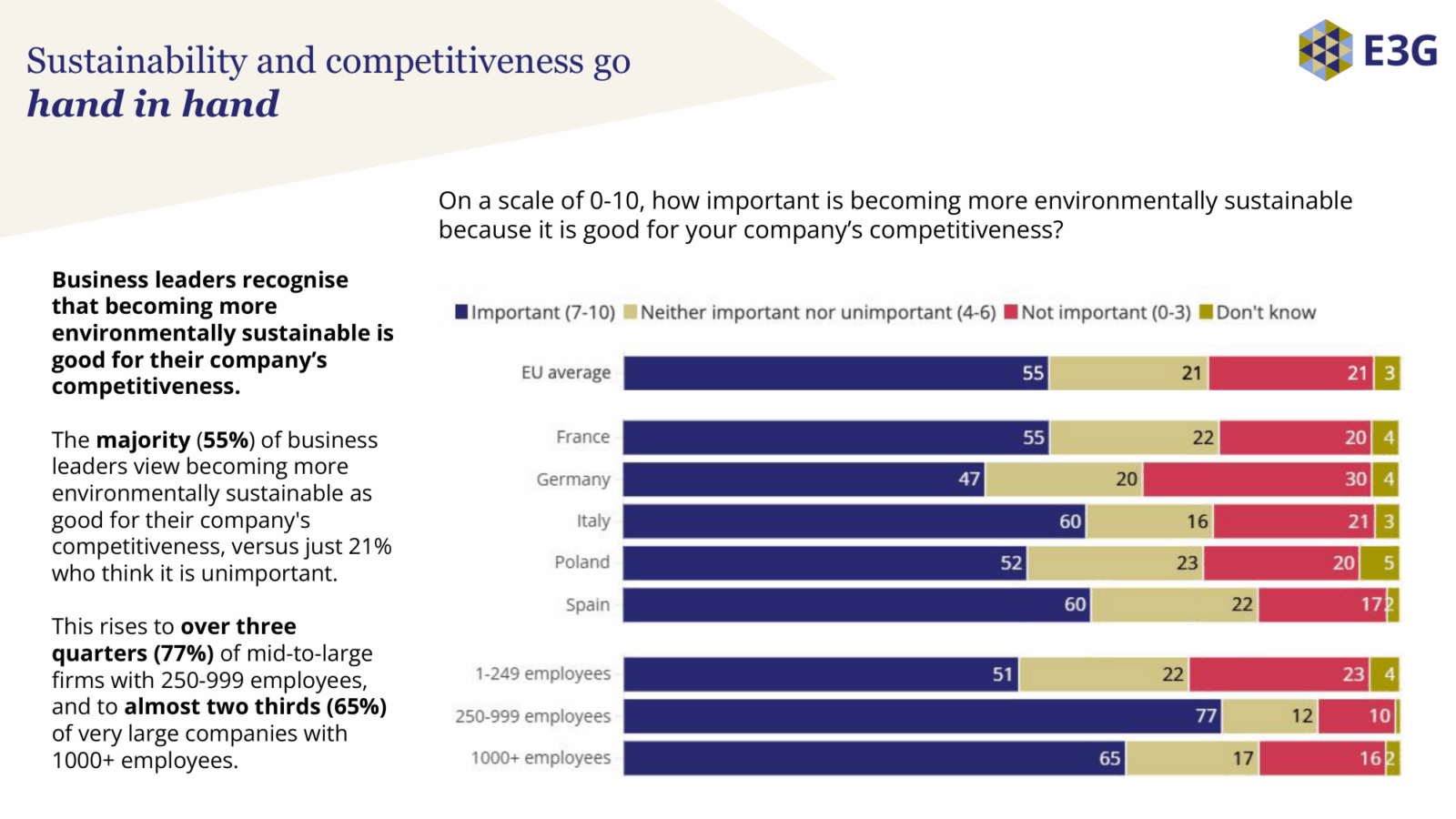 📊 Wettbewerbsfaktor: Mehr als 55 % der Unternehmen sehen Nachhaltigkeit als entscheidend für ihre Wettbewerbsfähigkeit. Nur 21 % halten sie für unwichtig.