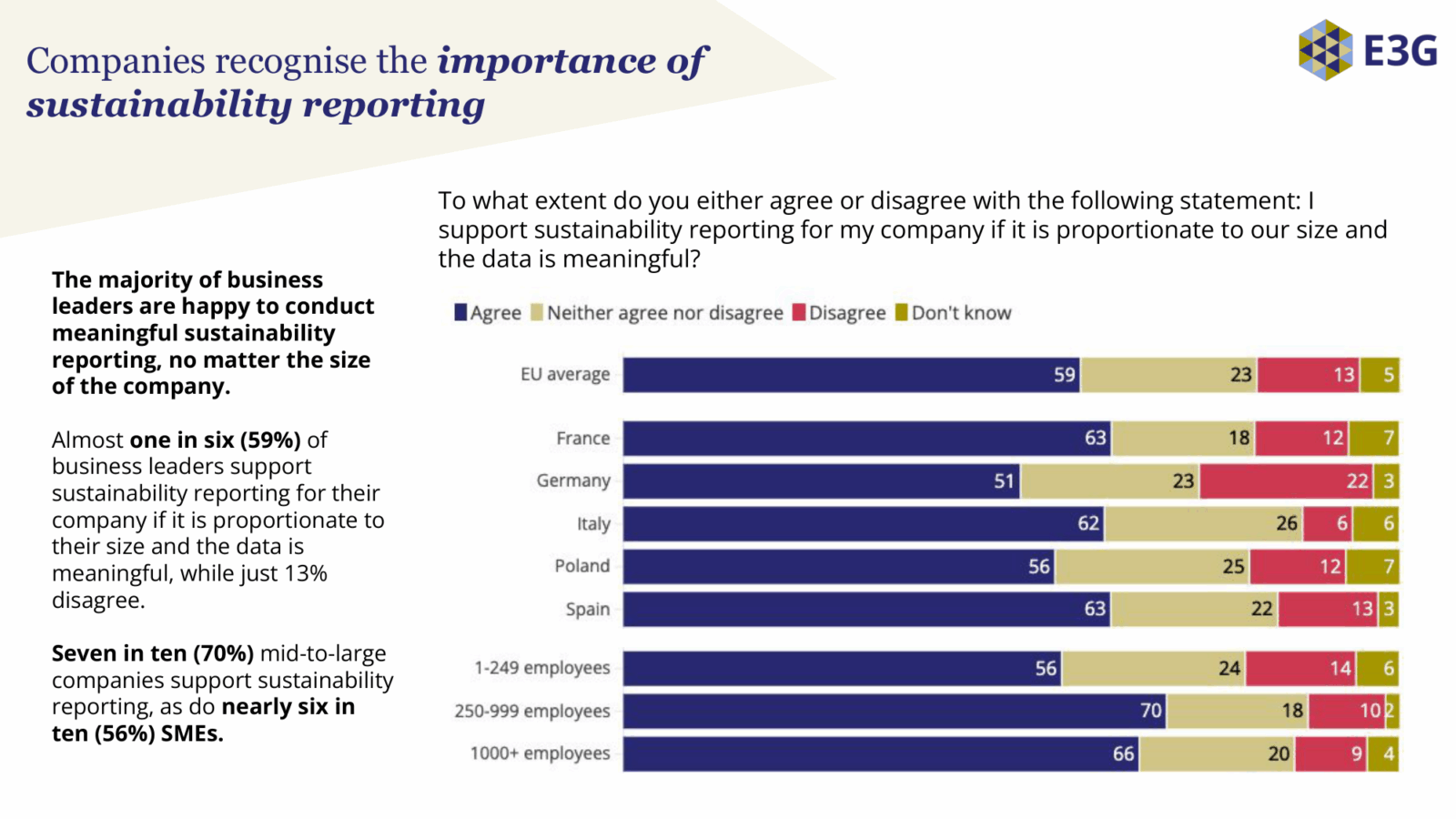 Eine aktuelle Umfrage von E3G/YouGov (👉 hier geht es zur Studie "What European business leaders think about the EU’s corporate sustainability and due diligence rules) unter 2.543 Führungskräften in Deutschland, Frankreich, Spanien, Italien und Polen zeigt genau das: Unternehmer wollen nicht weniger Nachhaltigkeit – sie wollen klare, faire Regeln und Planungssicherheit. Denn: Sustainable business is competitive business.